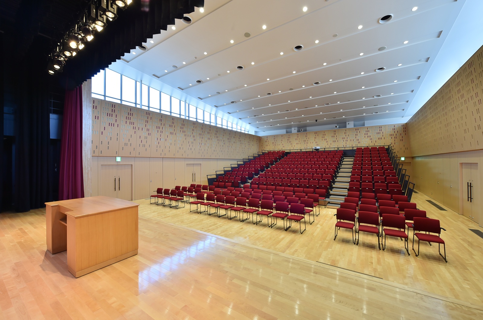 ステージ、音響・照明設備、ロールバックチェア、スタッキングチェア、会議テーブルを備え、音楽・演劇・研修会・会議など多目的な利用が可能なホールとなっております。