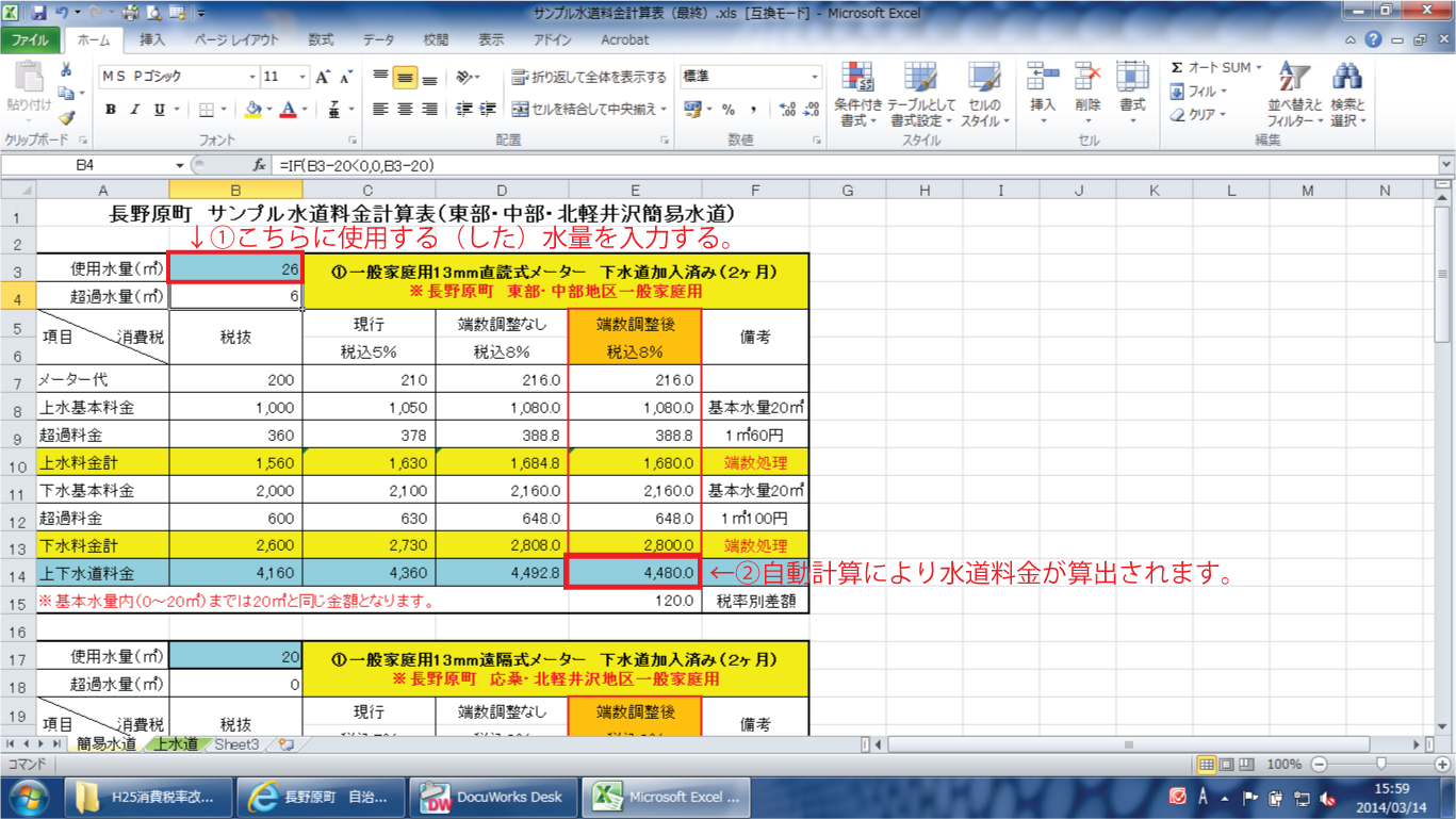 消費税率が改定され、従来の水道料金との比較用にサンプル水道料金計算表(Microsoft Excel)を作成しました。
